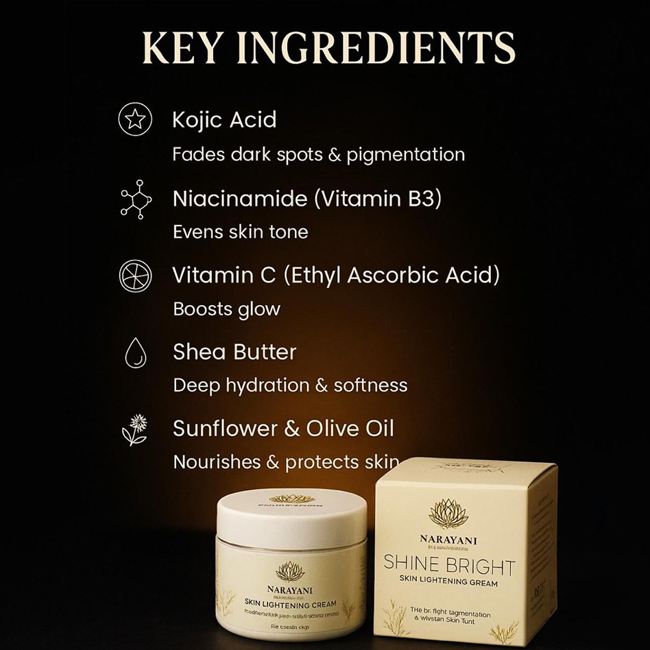 Take a small amount of the Shine Bright Skin Lightening Cream and gently massage it into your face and neck areas with uneven skin tone, dark spots, or hyperpigmentation. For best results, apply the cream in the morning and evening.
